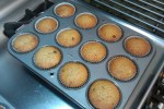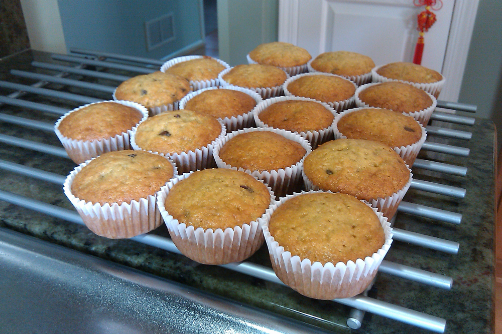At this point, go ahead and start preheating the oven to 350 degrees. Fold in the mashed bananas and chocolate chips into the dough mixture and finish stirring that up. Take out a muffin tray and put some paper liners down into the holes. From my dough distribution, I made about 18 muffins, but it can vary to anywhere from 16 – 20, so you might need two pans like I did. The key is to fill each liner two-thirds of the way through with dough, so I used a 1/4 cup measurer from the measuring cup set to make the job easier. Throw the muffin pans into the oven for 23 minutes, or until you poke a toothpick into the muffins and it comes out clean. Wait about 5 minutes for the muffins to cool off, and then take them out of the trays and set them on a plate.