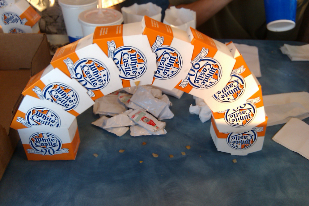 White Castle is just one of those places you take a trip out to once in a while just to say that “you did it.” Some might say it’s disgusting, some might say it’s delicious, but at the end of the day, it boils down to how grand of a sculpture that you can build with your empty slider boxes. We managed to get an archway going today, but last visit we built some random snake-looking thing that was taller than our heads when we sat at the table. Now that was awesome.
