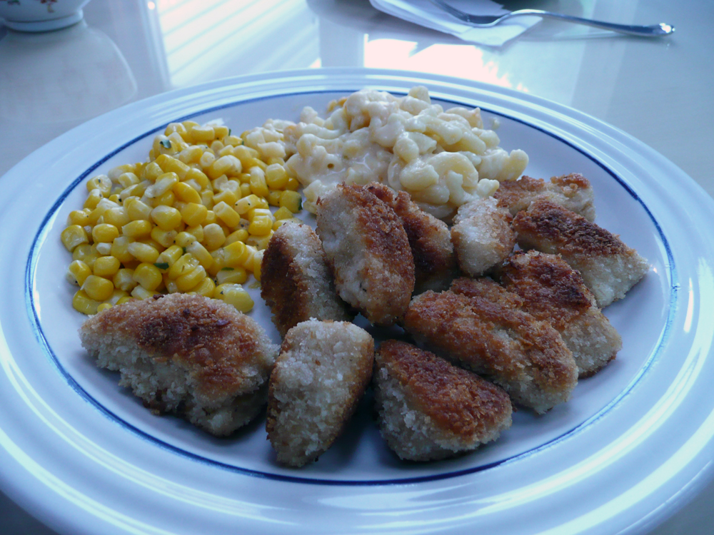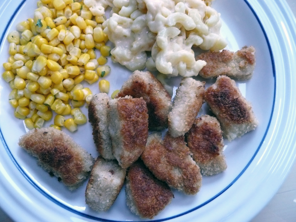 We served the chicken nuggets tonight with some peppered corn, macaroni & cheese, and some barbecue dipping sauce. The texture came out beautifully, the chicken was nice and moist, and the taste of the chicken was amazing.