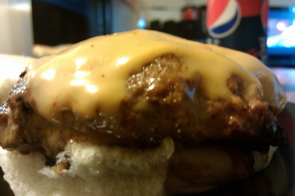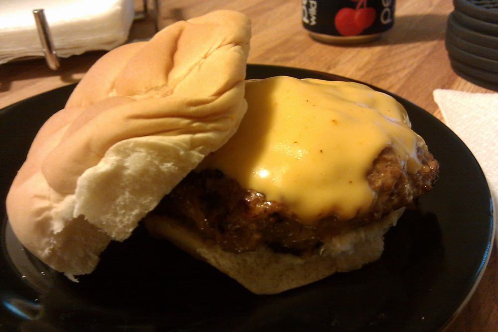 Next, add in the cheddar cheese, ketchup, salt, pepper, oregano, steak sauce, and Tabasco sauce. Mix it up really well until all the ingredients look evenly distributed within the meat. It’s now that you should start to form a test patty. This patty will tell you how well the meat is holding together. More than likely, because of all the liquid components that you added into the meat, if you hold the patty vertically, it will break apart. This is where the breadcrumbs will come in, which will serve to absorb the extra moisture. So, sprinkle some of that into the meat mixture, maybe about 3 or 4 tablespoons of it. Mix up the meat again, and try the test patty again. If it still feels like it’s falling apart too easily, add another tablespoon of breadcrumbs to it. Fire up the grill (or pan) and set it to medium-high heat. Cook each side of the burger for about 3 minutes (or adjust for varying done-ness). Throw a slice of cheese on the top of the burger as well for some added goodness if you so desire.