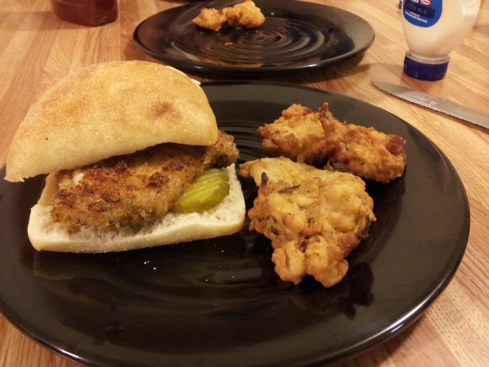 After it’s all done, you can take it off the stove immediately to some bread or onto a wire rack to allow some of the residual oil drip off. I had mine over some ciabatta with some mayo and pickles slices. It was really great, since the bread and the panko gave everything a nice crunch, while the pork was still really moist inside. The mayo and added saltiness of the pickle definitely helped give some depth in flavor. The outer coating of the pork loin also had the taste from the spices added in the egg mixture earlier, which helped to round it out.