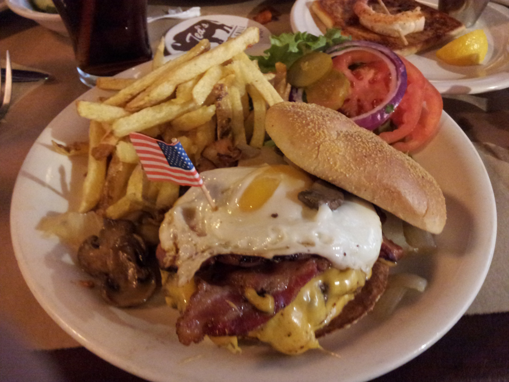 Ground bison topped with grilled ham, bacon, grilled onions, mushrooms, melted American cheese, and a fried egg.