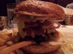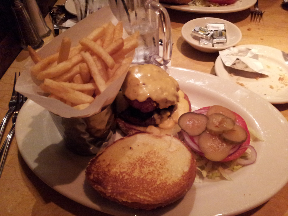 The burger was cooked just right at medium rare with a nice melted slice of cheddar cheese and the fried mac and cheese loaded on top of that, with more cheese to boot. Add in some toasted hamburger buns, lettuce, tomatoes, red onions, and pickles, and you had one fantastic cheese-filled sensation. The creaminess of the mac and cheese makes the burger extra moist, with the fried breading adding a little bit of crunch to it.