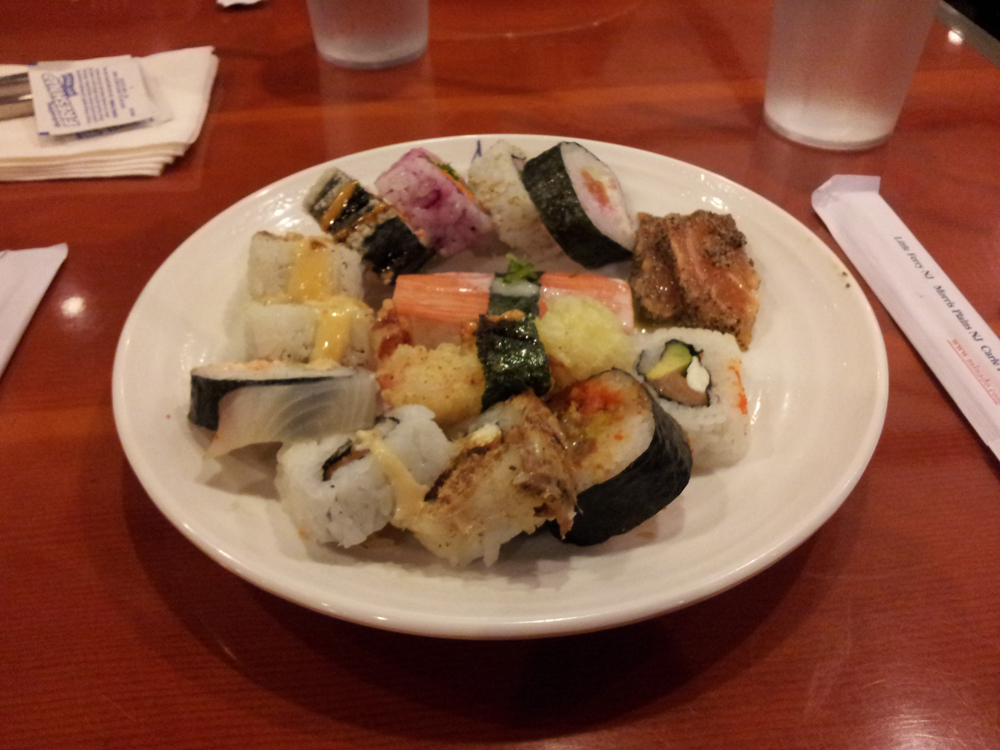 When you first walk in, it is clear that there are a number of different stations dedicated to various types of Japanese food, ranging from the maki rolls to sashimi to hibachi to the hot foods. The dining area is extremely spacious, and the high ceilings prompted me to wonder if the previous occupier of the space was a storefront of some kind. After being seated, we eagerly decided to hit up the buffet line. I quickly started off with a full plate of the maki rolls, nabbing right around 13 rolls. I was impressed by the number of different maki rolls being offered as I was pondering what to put onto my plate.