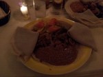 For my main dish, I went with the zilzil strips, pieces of lamb that were marinated in Ethiopian honey wine, garlic, and onions and fried in some seasoned butter. For my two vegetable dishes, I went with the ful (Ethiopian beans that were cooked with tomatoes, onions, hot green peppers, and a bunch of spices) and the atakilt wat (green beans, carrots, potatoes, peppers, and onions sautéed with garlic and tomatoes). And of course, the unlimited injera served on the side. I’m sure that my well-lit photo of the food above is a great reference to what everything looked like. Also, none of the dishes came with utensils, because you are supposed to use the injera to pick up everything and eat it (similar to how naan is to Indian cuisine, I believe).