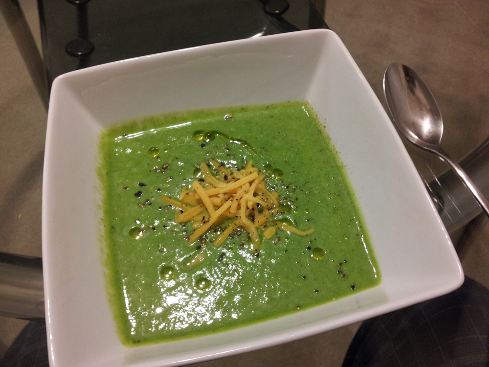 - A rich, green soup finished with cheddar cheese, olive oil, and ground black pepper.