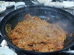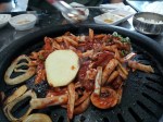 We got our first plate of meats, which was the chadol bakgi, or brisket slices. The slices came out all curled up, but once they were put onto the grill, they unraveled into flat pieces, which was really neat to see. The brisket itself was very tasty, and even more so when dipped into the Korean soy sauce or the salty sesame oil and then eaten with some rice. For our second round of meats, we opted to try the jang sam kyup sal, or spicy pork belly. The strips came out on the plate soaked in the red chili sauce marinade, topped off with some scallions. The immediate sizzle when throwing them into the grill and the smell was enough to make you even hungrier. The pork belly had a great sweet and spicy flavor from the marinade, and the cut had a great texture contrast between the meat and the fat.