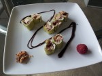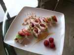 The first one leaned a little bit more on the tart side because of the raspberries, but had a great aftertaste provided by the Andes mints. The second one was pretty sweet, with the melted chocolate and honey right inside the roll. The final roll, our “Rainbow Roll,” had a great blend of the Reese’s peanut butter/chocolate flavors and raspberry tartness, countered by the sweeter taste of the fruit slices on top. The last roll was definitely my favorite, from both a presentation and taste standpoint.