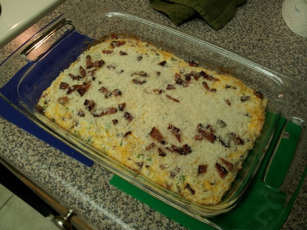 Put your two packages of Neufchâtel cheese into a large bowl and warm them in the microwave for 45 seconds to a minute to soften them up (it will make the mixing process a lot easier). Mix into that bowl your cheddar cheese, bacon, diced jalapeños, and garlic powder. If you want an added kick, put in the Tabasco sauce as well. Spoon this mixture into a 7″ x 11″ casserole dish and then top it with your bacon-breadcrumb mixture. Cover the dish and into the oven it goes for 15 – 18 minutes.