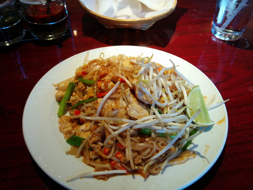 The menu offers a wide array of items to try, including curries, noodle dishes, rice dishes, and soups. I stuck with my chicken pad thai, which for some reason, is normally the first dish that I try at any new Thai restaurant I go to. After I placed the order, one of the waitresses came out and brought me some shrimp chips, which are a popular snack in southeast Asia. It was the first time that I had seen a Thai restaurant serve those chips as a starter.