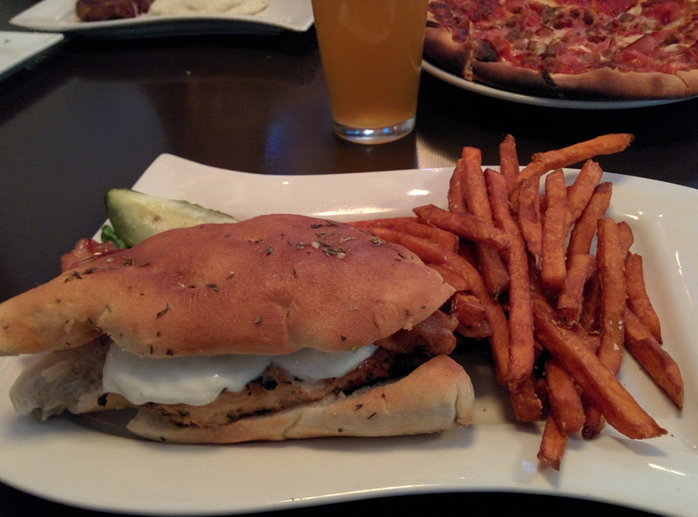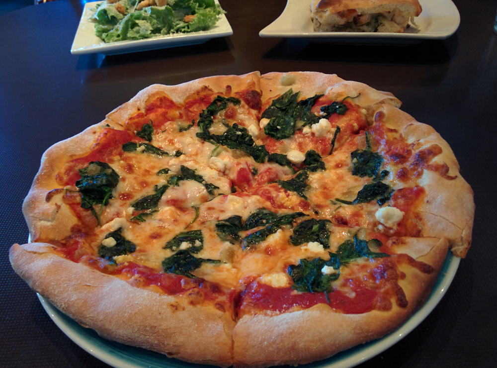 Ruddy Duck’s menu offers a wide variety of options to choose from: sandwiches to pizza, salads to pasta, seafood to steaks. Mike and Tina had both spoken highly about their pizzas, so I went with the Popeye’s Pie, topped with spinach, goat cheese, and tomato sauce. Tina had the Italian Three-Cheese Panini with chicken (which I tried later, and it was absolutely amazing). I got excited at the prospect of having wood-fired pizza again, since I think the cooking method definitely gives the pizza a different quality than the conventional oven cooking style.