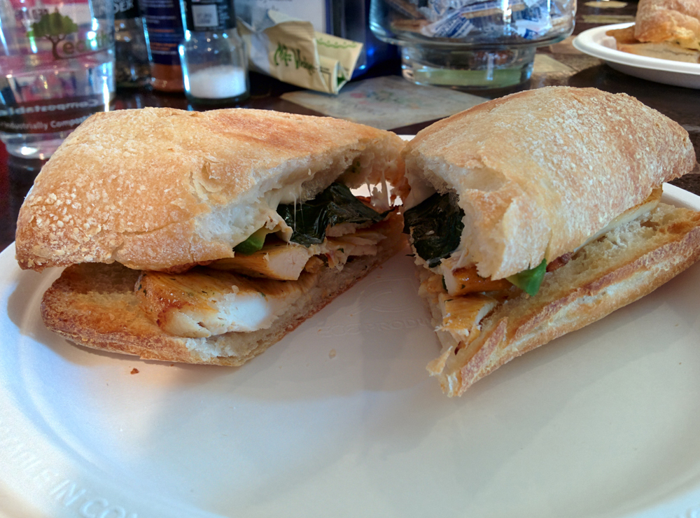 When you first walk in, the ordering counter is in front of you, with copies of their menu and a poster mounted underneath with some pictures of their various sandwiches, soups, wraps, and salads. The selection was very extensive, and I was hard pressed to choose what I wanted. Mike and Tina had been to the restaurant multiple times, and consistently talked about the cajun catfish sandwich (which I tried during my following visit, and it certainly did not disappoint). I eventually stuck with the chicken, avocado, basil, and mozzarella sandwich, while the two of them got the cajun catfish.