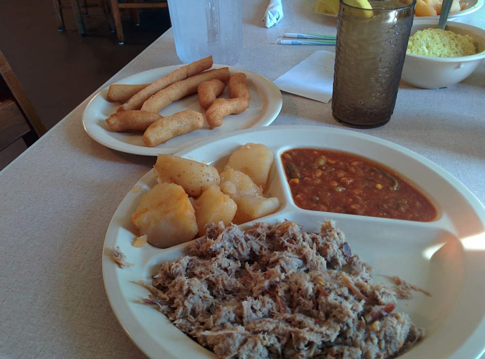This was my first experience with authentic Carolina-style barbecue, where spices and vinegar are predominantly used during the smoking of meats and no barbecue sauce additives are needed. I went with the barbecue pork dinner plate, which came with pulled pork, boiled potatoes, Brunswick stew, and corn sticks. Chris and I also got some hush puppies to split.