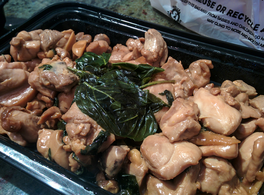 Chicken thigh chunks loaded with garlic cloves, ginger slices, and whole basil leaves, cooked in a sauce mixture of soy sauce, rice wine, and sesame oil to make for a truly aromatic dish.