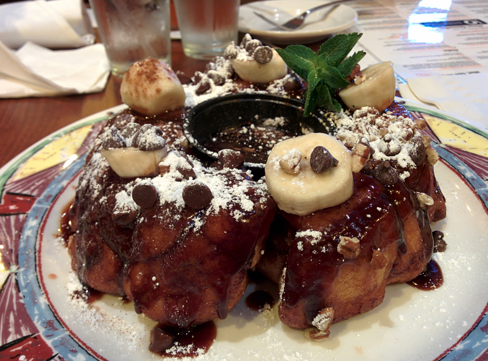 One thing that I was impressed about was that even though the dining room was packed, the kitchen was still cranking out dishes at a ridiculous rate. We received our monkey bread in no time, and immediately started to dive right in. Warm cinnamon pull-apart bread covered with chocolate syrup, pecans, banana slices, and confectioner’s sugar, the monkey bread is an absolute dream for a person with a sweet tooth (like me!).