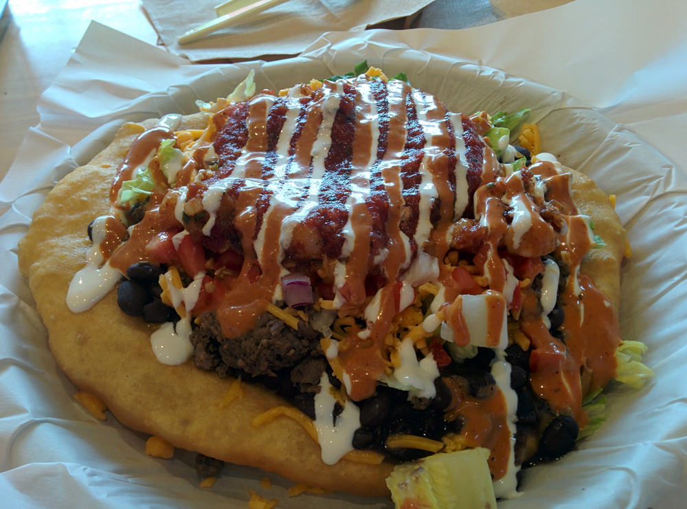 Frybread topped with ground bison, black beans, lettuce, shredded cheddar cheese, tomato and hominy salsa, sour cream, and chipotle sauce.