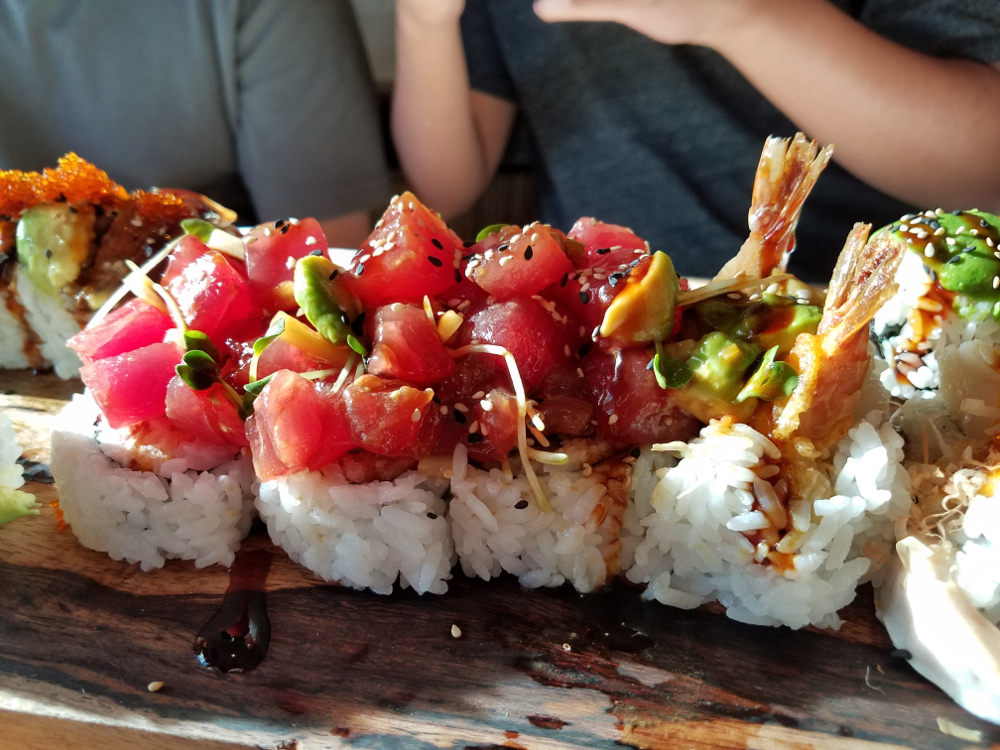 Shrimp tempura and crab roll wrapped with avocado and topped with Ahi poke, with a drizzle of unagi sauce and agave nectar.