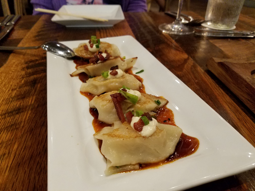 Because of how hungry we were, we all decided to start off with some appetizers (or “pu pu” in Hawaiian). Sierra recommended for us to try their pork & shrimp potstickers, one of their most popular appetizers. To pair up with that, we also ordered the Eating House Rainbow Poke, featuring Hawaiian kampachi, ahi tuna, and salmon, finished off with an orange yuzu soy glaze and crushed pine nuts.