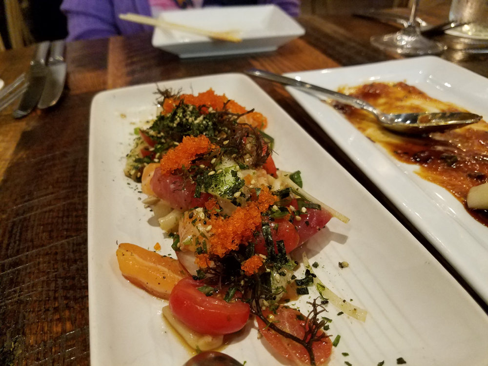 Hawaiian kampachi, ahi tuna, and salmon, all mixed with cherry tomatoes, orange bits, and cucumbers. Garnished with furikake, tobiko, and a orange yuzu soy marinade.