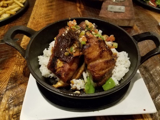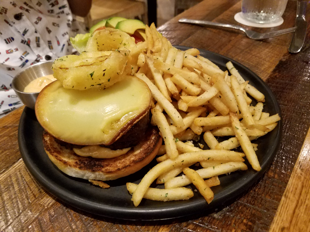 It was my brother’s burger dish, however, that really stole the show. The hapa burger patty featured a mix of ground beef, Portuguese sausage, and wild boar, topped with smoked gouda cheese, chipotle aioli, two fried onion rings, caramelized onions, avocado slices, lettuce, and tomatoes. Now you talk about a gourmet burger right there. Sweet, savory, spicy, smoky, it had it all. The toasted bun and onion rings gave the burger a nice little crunch each time you took a bite. The flavors were all balanced and never overpowered each other. I think my brother had to actually take a moment to wipe away a tear of happiness after he finished eating that burger. If I could give it a double star recommendation ranking in my Dish Spotlight below, I really would.