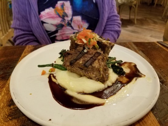 Short ribs served over a bed of horseradish potato purée, local kale, and a sweet onion demi glace.