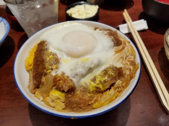 Bowl of rice topped with pork katsu, onions, tonkatsu sauce, and an over-easy egg.