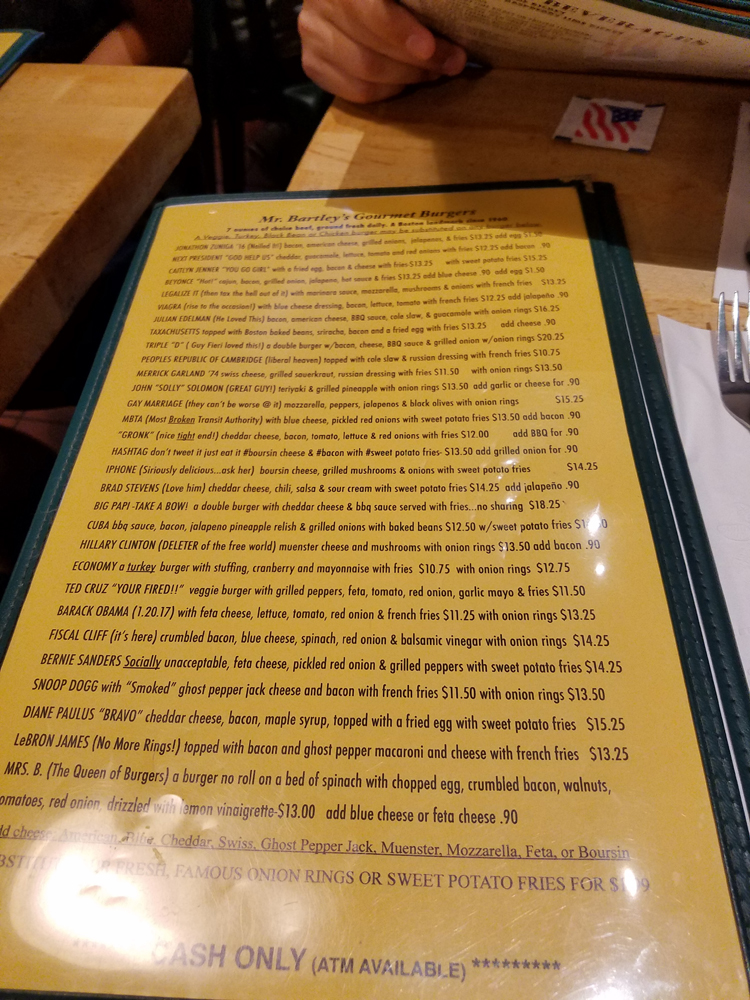 And finally, here are my rankings for Mr. Bartley’s Burger Cottage: