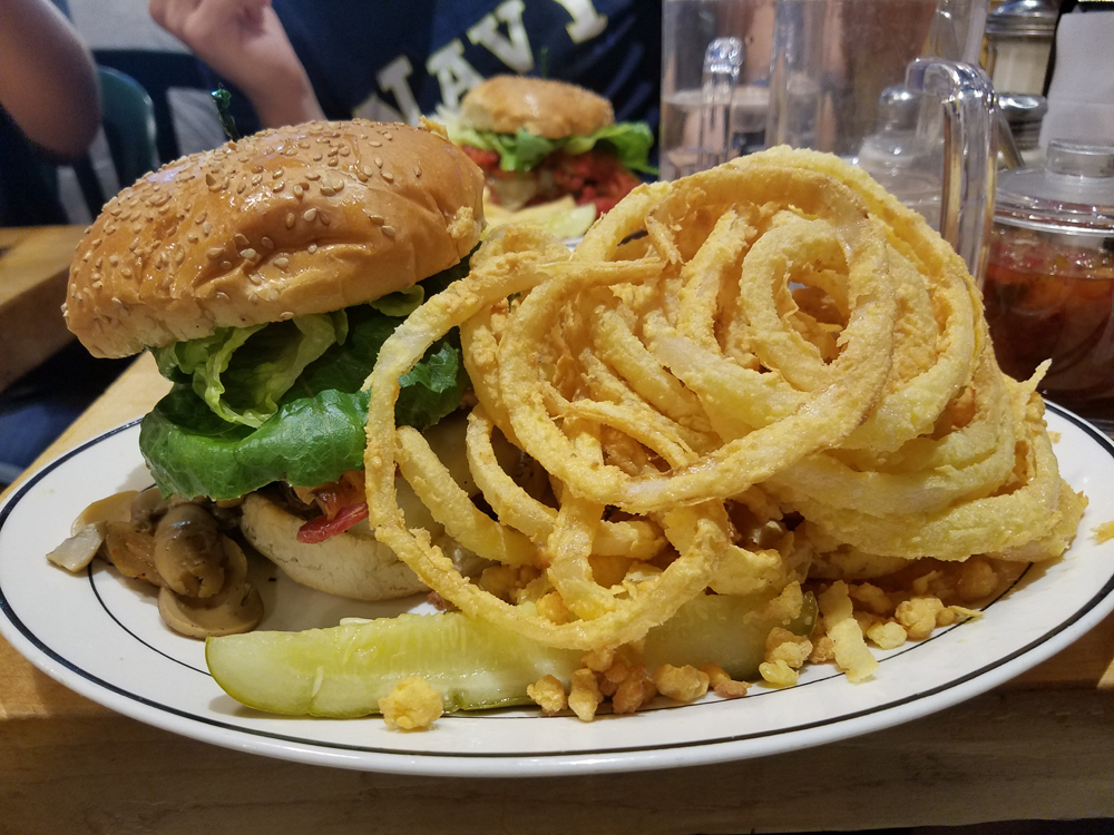 Muenster cheese, mushrooms, with added bacon. Served with onion rings.