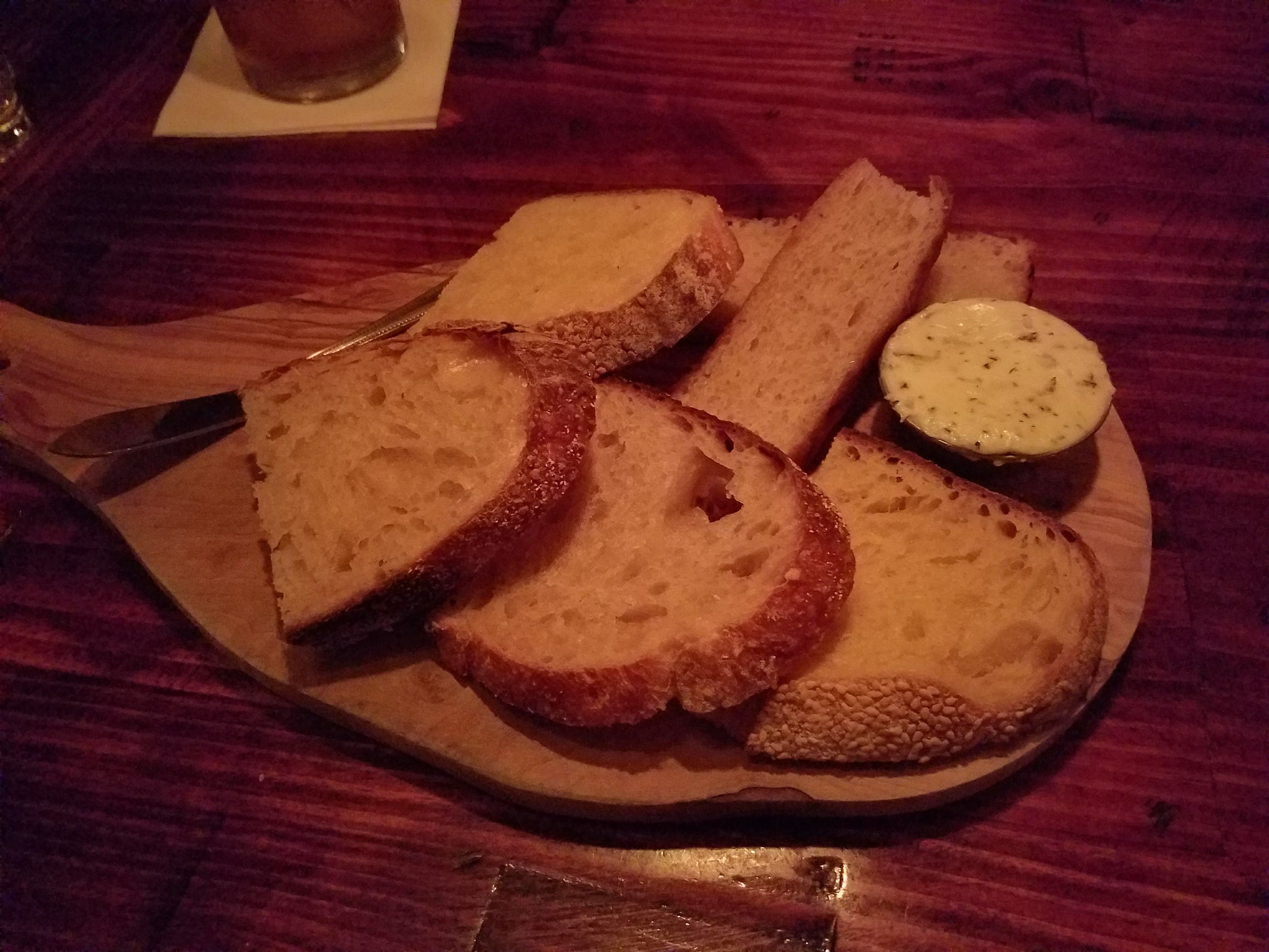 You’ll be hard pressed to find out what kind of food The Rest offers, because they don’t publicize their menu, whether that be online or posted somewhere in Bodega. From how our waiter described the menu, it also sounded like there were a few seasonal dishes that they rotate out periodically. Since Mike and Tina had been to the place before, they had a few pointers about dishes to go for and what to avoid. In the end, we decided to start things off with a bread plate, while I got the fried chicken for an entrée and they both got the steak.