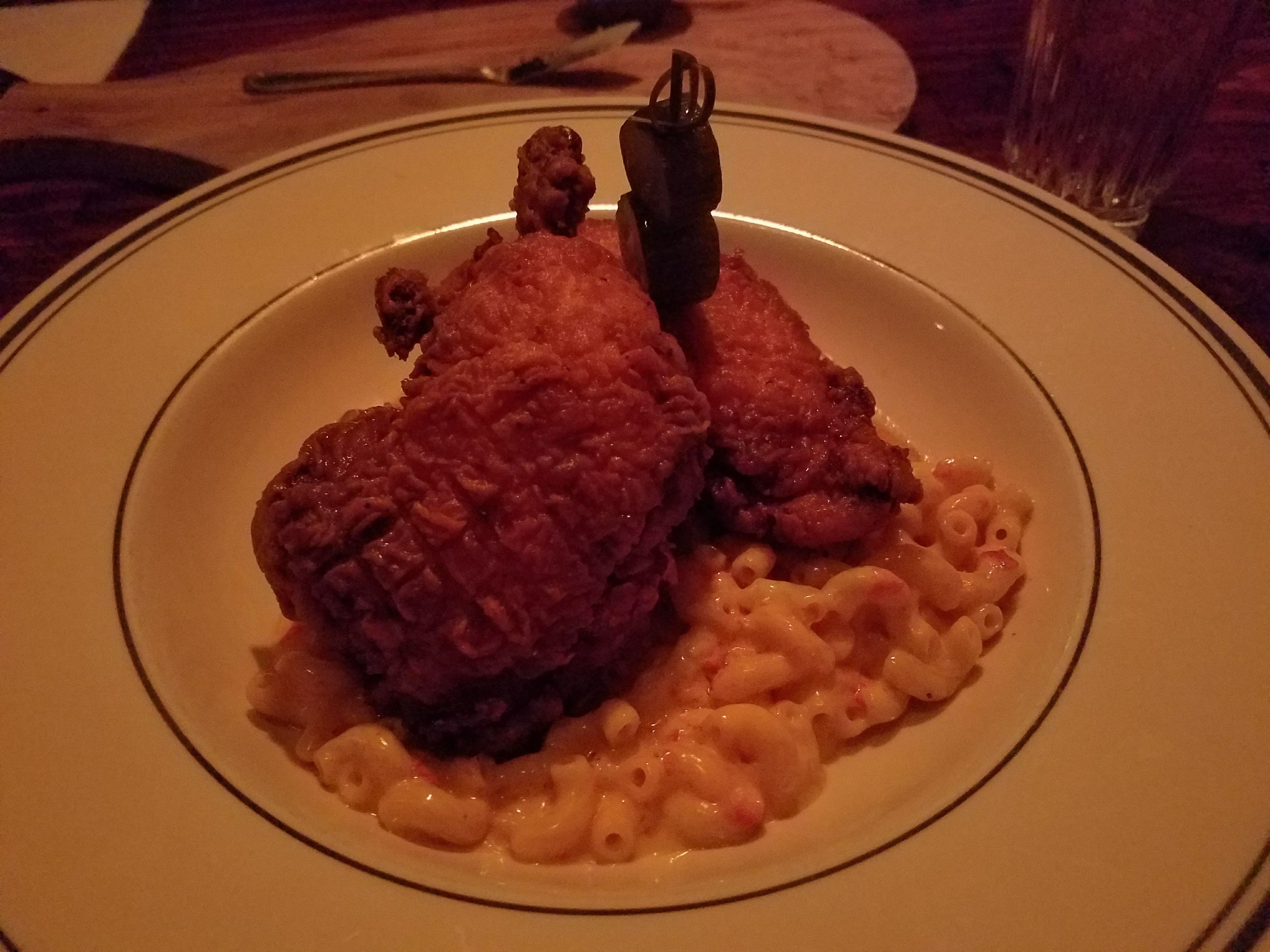 My dish was plated rather elegantly, with the two fried chicken thighs crossed over a bed of pimento mac & cheese. I took my first bite out of the chicken and was impressed with how moist and tender the meat was. The breading, however, was a little on the soggy side, and pulled off the chicken rather easily. I think it could have been attributed to plating the chicken over the piping hot mac & cheese, and the rising steam kept flowing over the breading. As for the mac & cheese, I thought that it had great taste, with the pimento cheese imparting its signature savory and spicy flavor combination. The pasta was also cooked al dente and helped to provide a texture contrast between the pasta and cheese sauce.