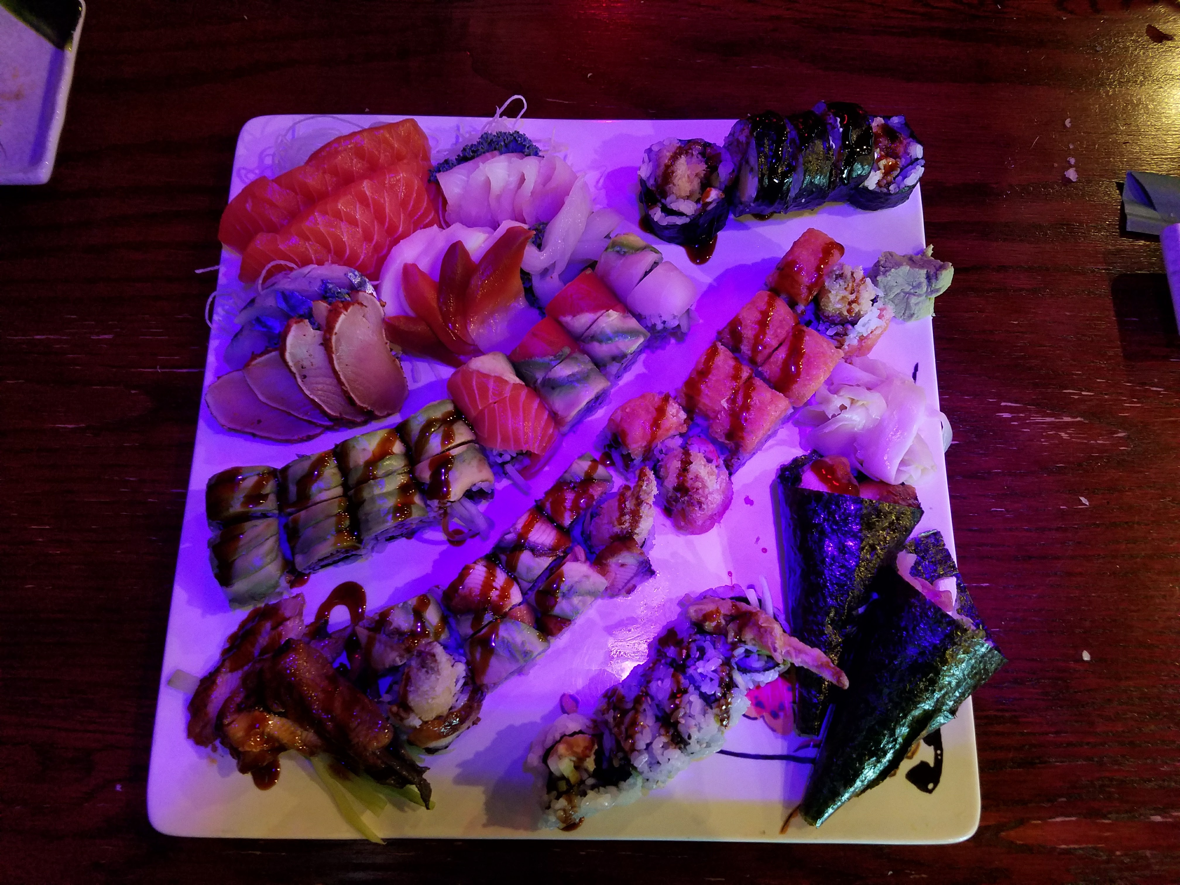 We’ve typically used the kitchen menu to order a few appetizers, like tempura, edamame, or seaweed salad, before moving on to the main attraction. On the sushi menu, outside of the typical sashimi or standard maki rolls, Ichiban has a robust 15 special rolls that you could choose from as well. In total, we still ordered a hefty amount of sushi, with 5 different special rolls, several handrolls, and almost 50 (!) pieces of sashimi. At these all-you-can-eat places, I’ve now gotten used to the “shock factor” that comes when they drop a giant square plate loaded up with sushi in front of you.