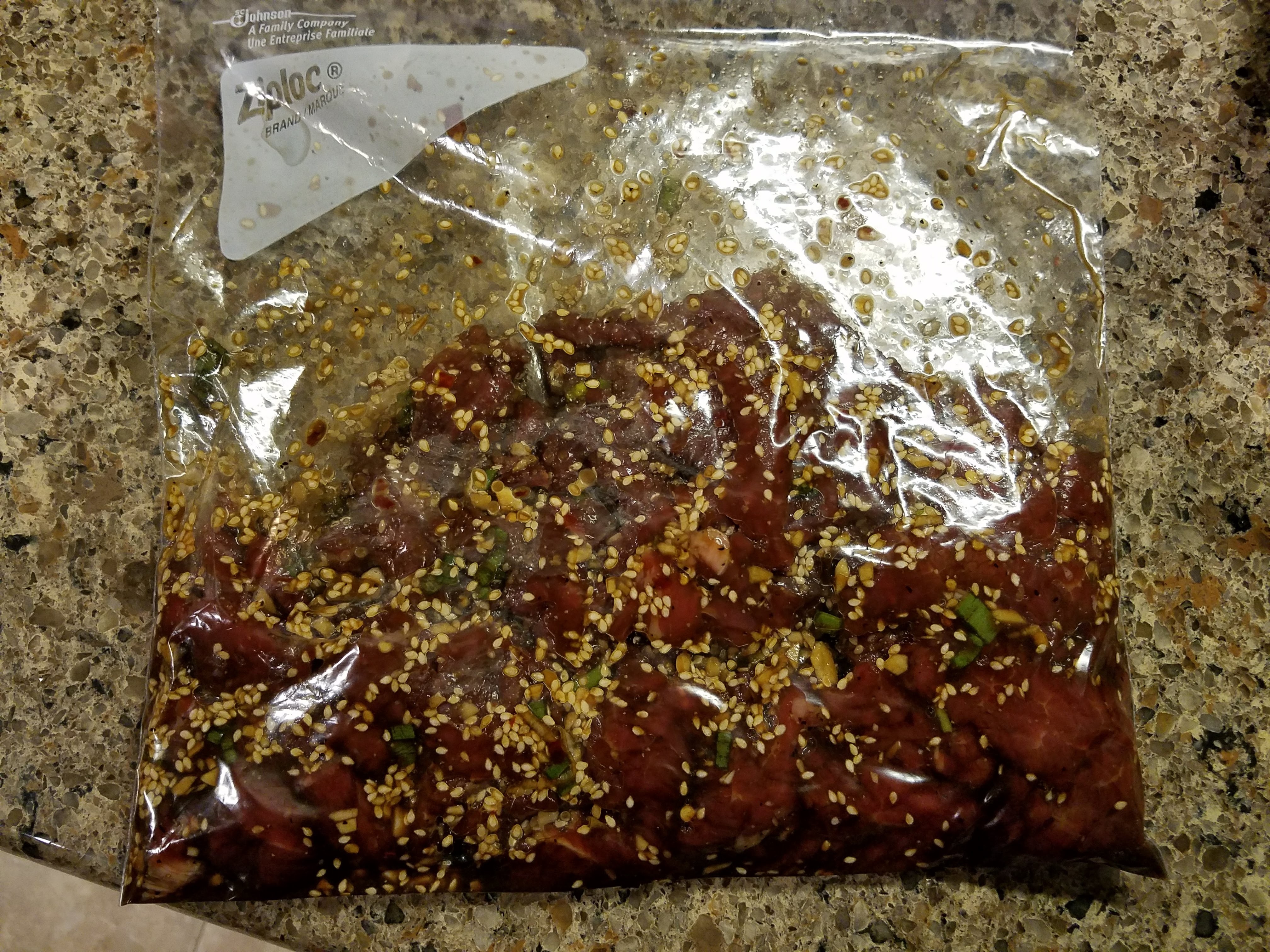 - Put your flank steak strips into a Ziploc freezer bag before also pouring in the marinade. Shake the bag and work the marinade around until it’s well distributed across all the pieces.