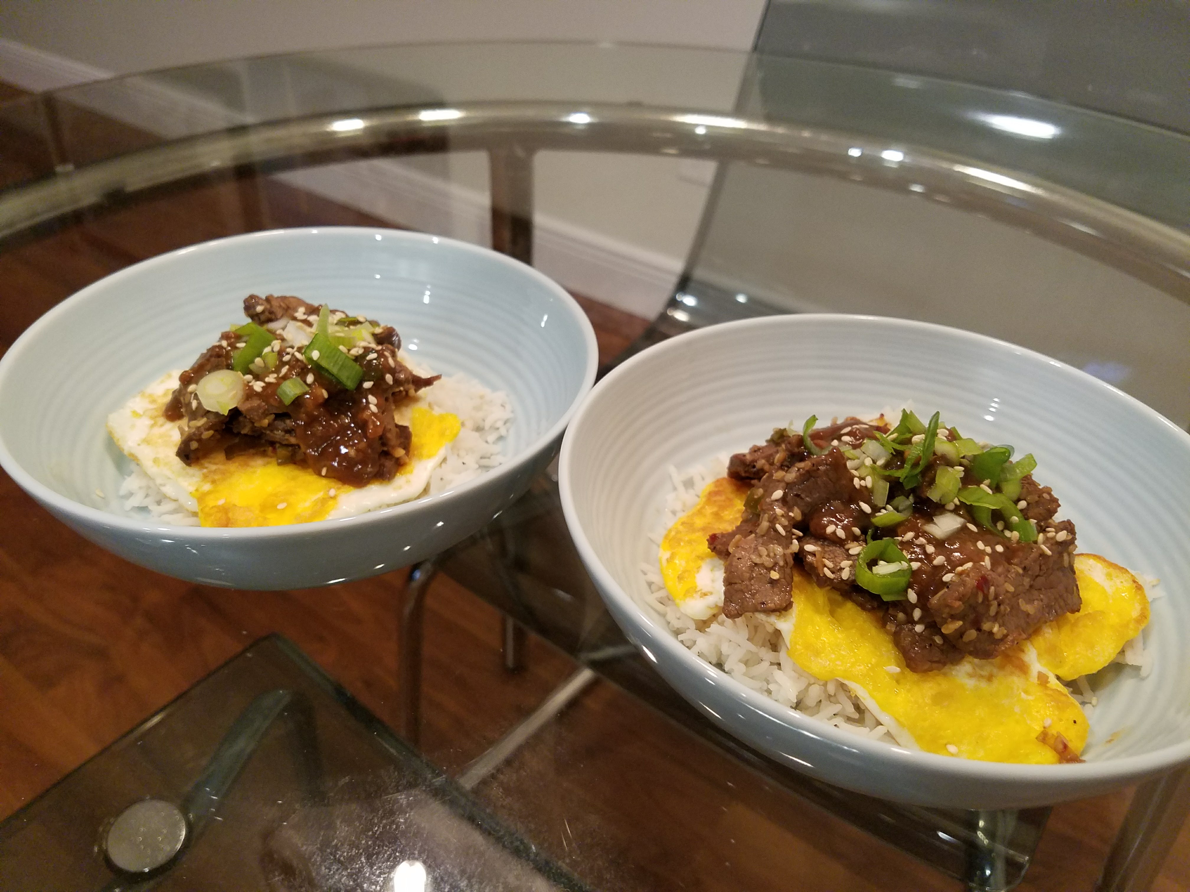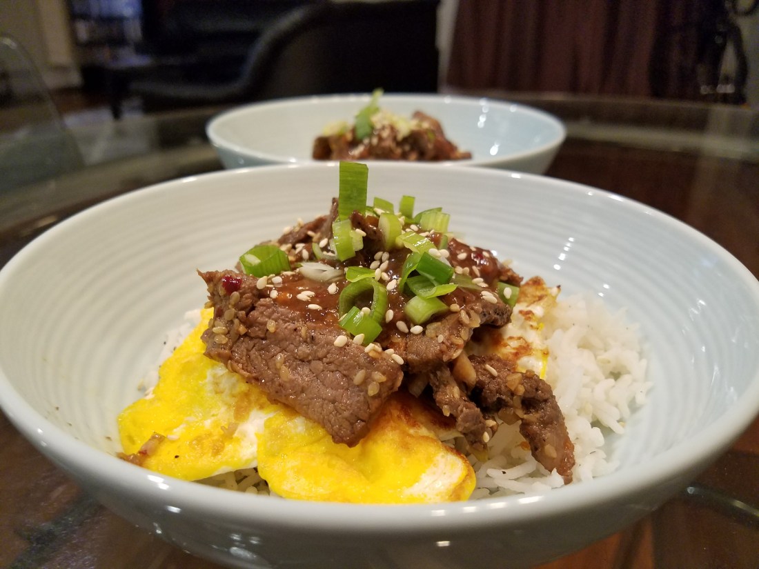 - For my plating style, I went with putting the steak strips onto a bed of jasmine rice, coupled with a fried egg. A few spoonfuls of sauce went on top of the meat, followed by some chopped scallions and sesame seeds for the garnish.