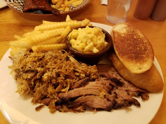 Slow smoked beef brisket with pulled BBQ pork. Served with sides of French fries, mac & cheese, and garlic bread.