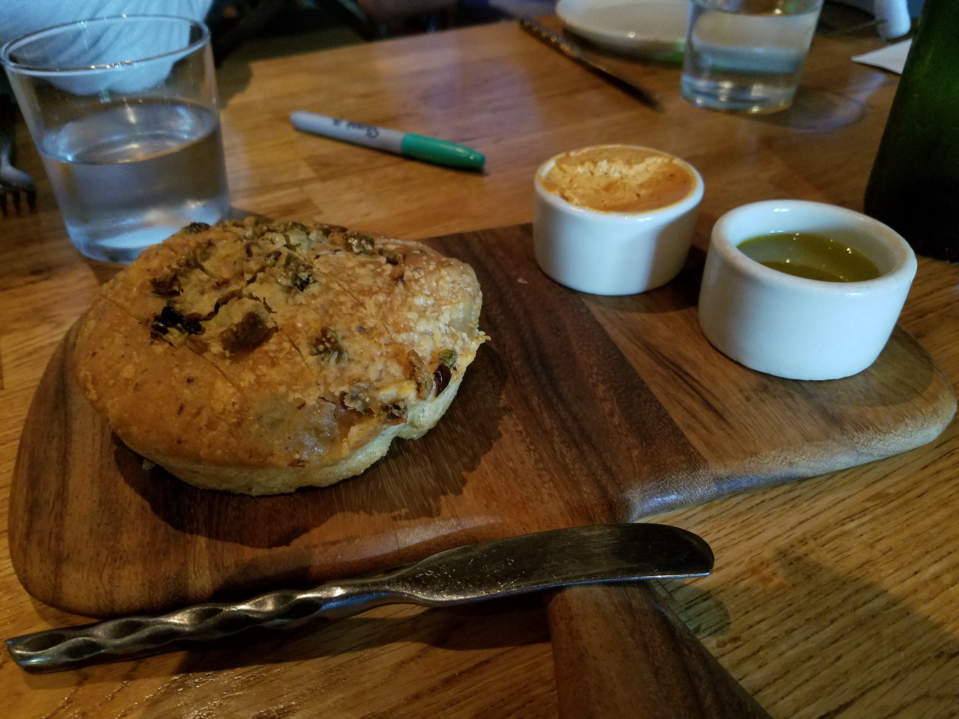 Olives baked into a loaf of focaccia, served with chipotle butter and lime zest olive oil.