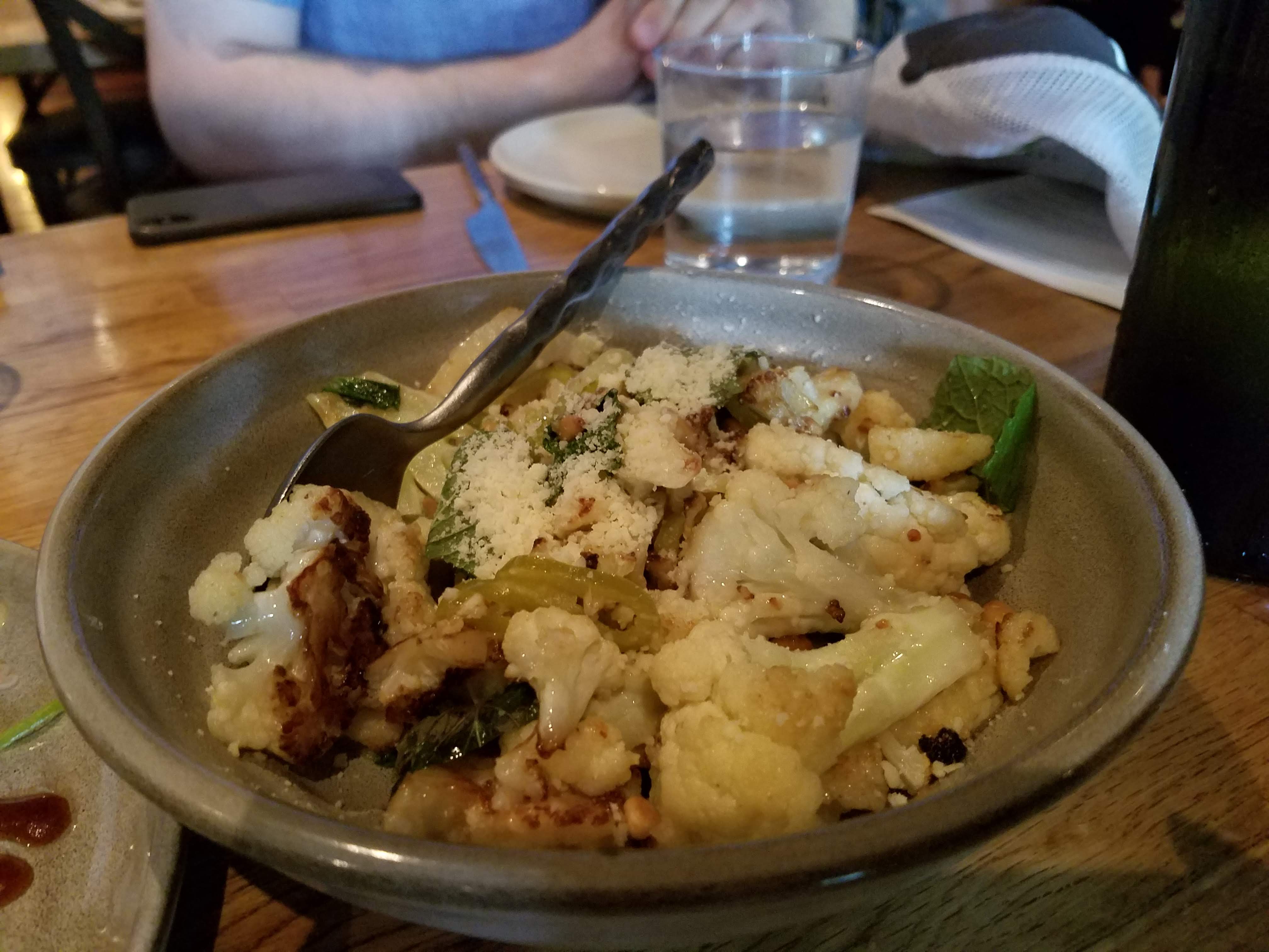 Cauliflower served with pickled peppers, mint leaves, pine nuts, and a light dusting of Parmesan cheese.