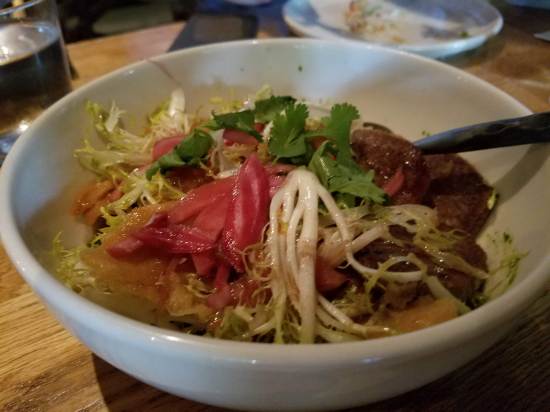 The next dish that came out of the kitchen was something that I was not expecting to try coming into the meal: braised beef tongue. My friend Julie said she had tried it before at another restaurant and had liked it; the rest of the table was feeling adventurous enough that we decided to go all-in on giving the beef tongue a shot as well. The tongue was sliced into thinner pieces, each probably about an eighth of an inch thick, and served with a variety of vegetables and some salsa verde. Being that it was my first time trying the beef tongue, I was pleasantly surprised at how flavorful it was. The braise on it was executed well, making each slice nice and tender, with no chewy sensation to it. The salsa verde also helped to give a nice splash of acid to the deep savory flavors cooked into the beef tongue.