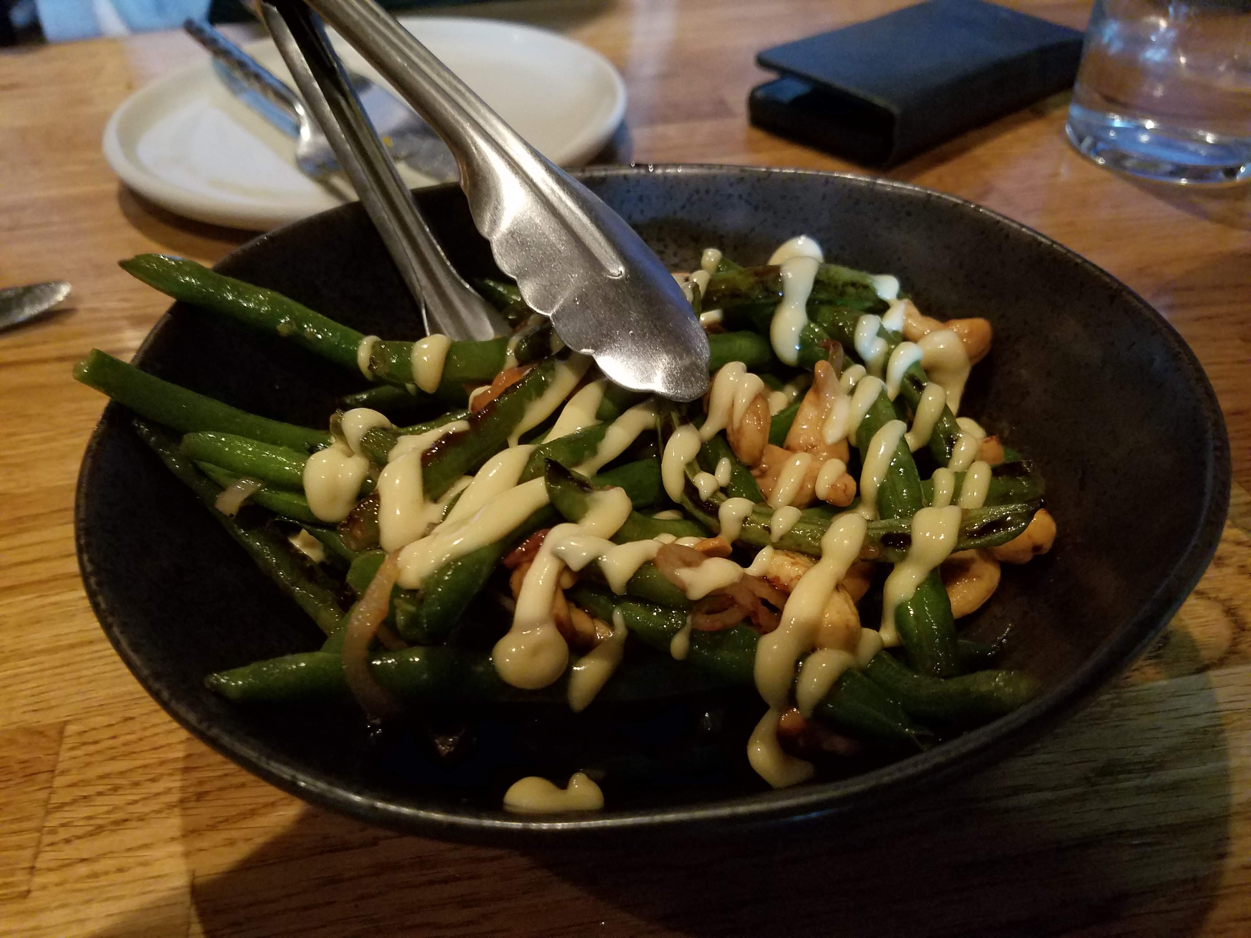 Green beans plated with sautéed onions and cashews, lightly topped with fish sauce vinaigrette and mayo.