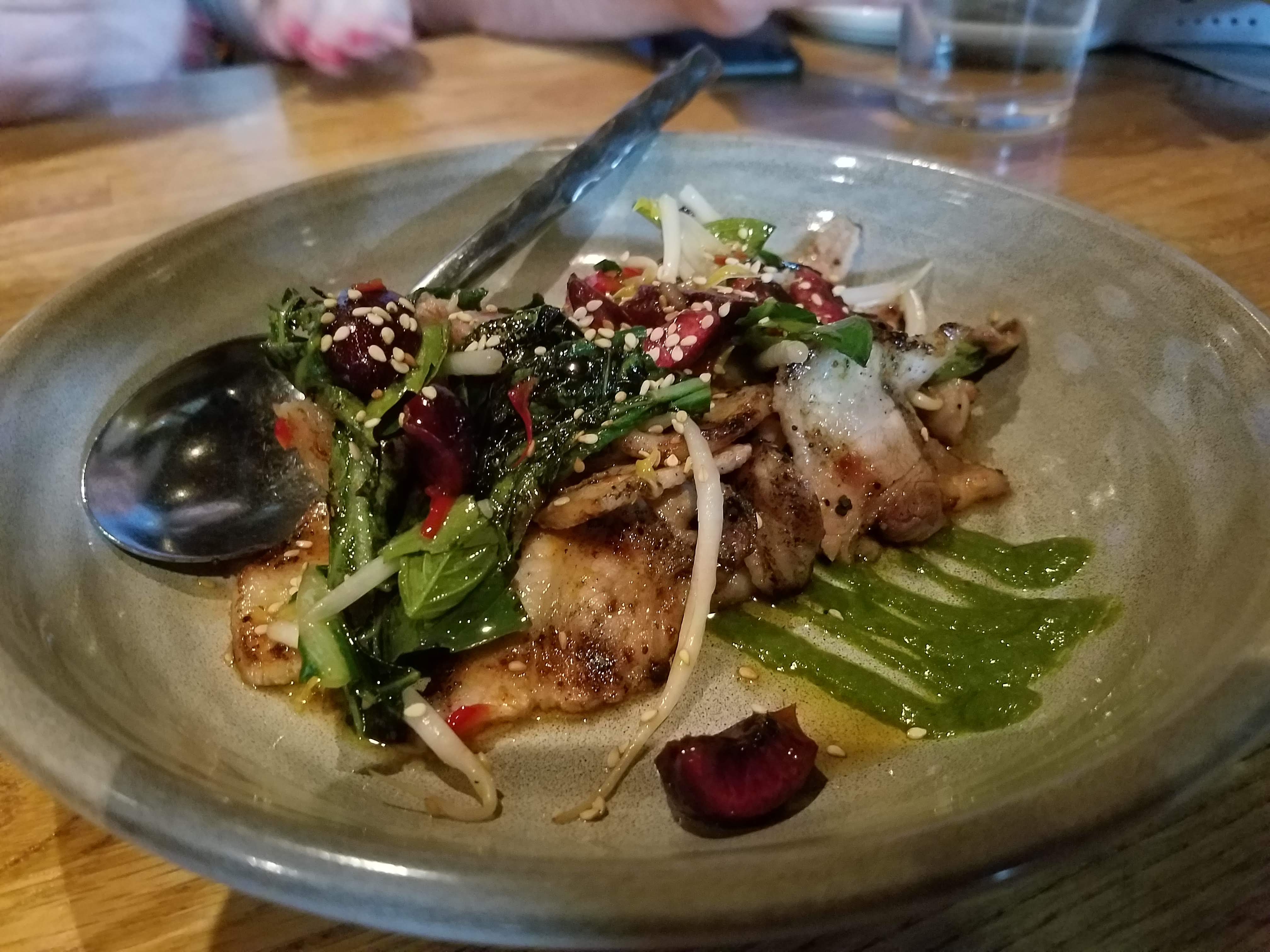 It was then time for our final trio of dishes: the wood grilled broccoli, sautéed green beans, and grilled pork belly. I’ll be honest — being a carnivore at heart, the dish that got me the most excited was the grilled pork belly. Thin sliced pieces of pork belly that were served with sautéed bok choy, bean sprouts, and marinated cherries, this dish was also executed very well, with the nice balance of savory and tangy flavors amongst all the components of the dish. I also appreciated that the slices of pork belly were all relatively tender, some having a nice crisp on the outer edge as well.