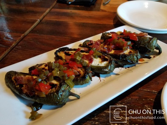Roasted jalapeño peppers stuffed with goat cheese, topped with bacon and a balsamic vinaigrette drizzle.