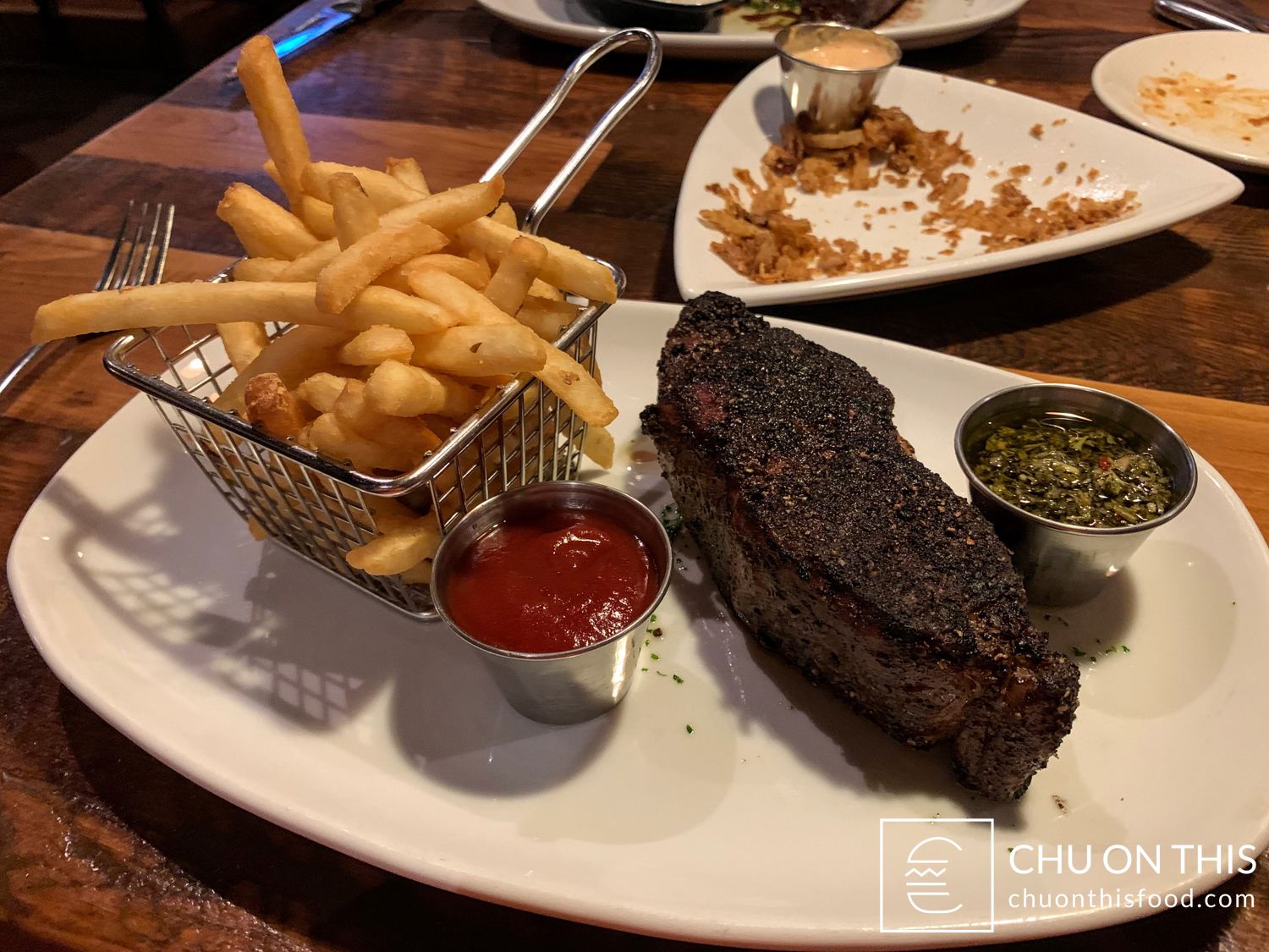 Dry-aged NY strip grilled to medium rare with a peppercorn crust. Served with french fries and housemade ketchup.
