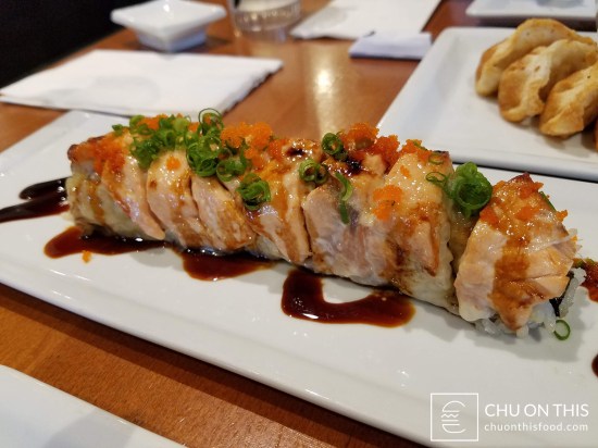 Krab stick and avocado on the inside, baked salmon on the outside, topped with tobiko, scallions, and eel sauce.