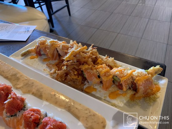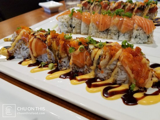 Krab meat, avocado, and cucumber on the inside, topped with salmon, eel, spicy mayo, eel sauce, and scallions.