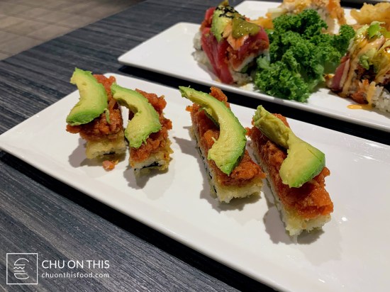 Spicy tuna served on crispy rice, topped with avocado slices.