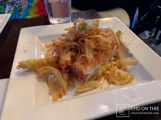 Spicy tuna and shrimp tempura on the inside, topped with spicy albacore and fried onions.