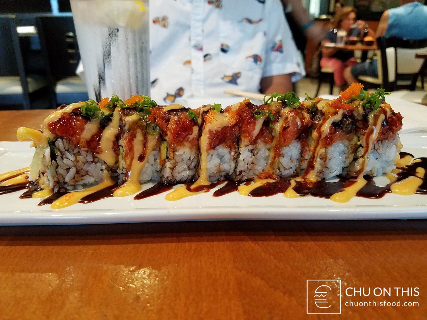 Krab stick, avocado, cucumber, and spicy tuna on the inside, eel on the outside. Topped with tobiko, scallions, spicy mayo, and eel sauce.