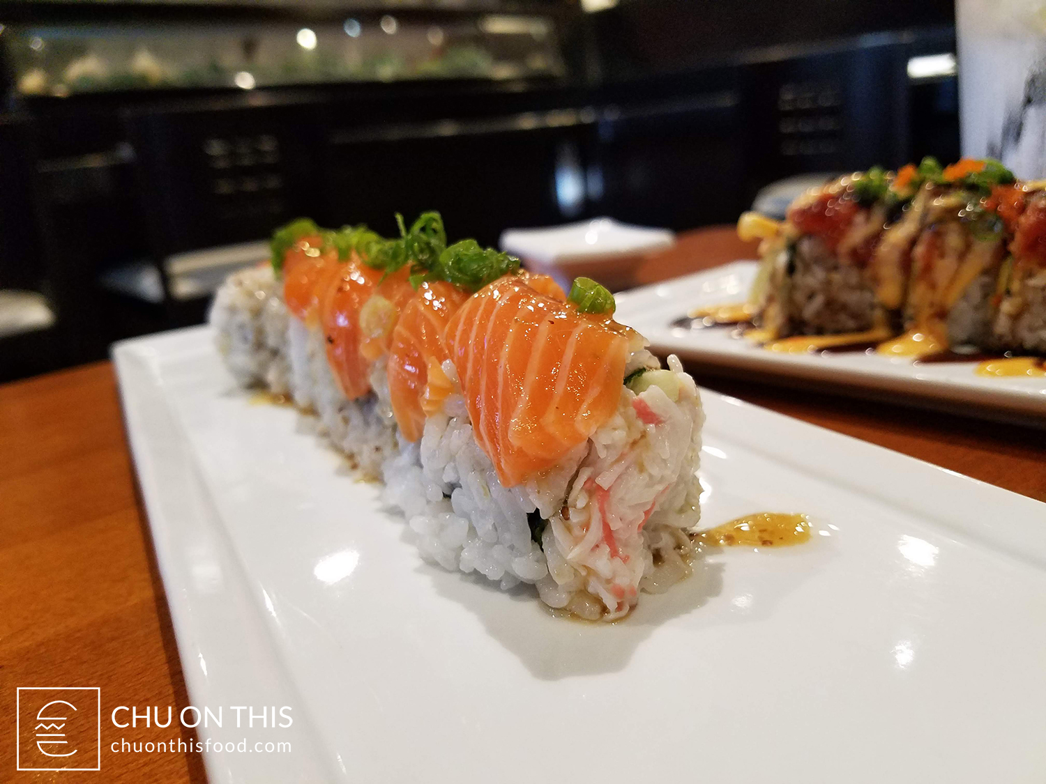 Krab stick and avocado on the inside, baked salmon on the outside, topped with tobiko, scallions, and eel sauce.