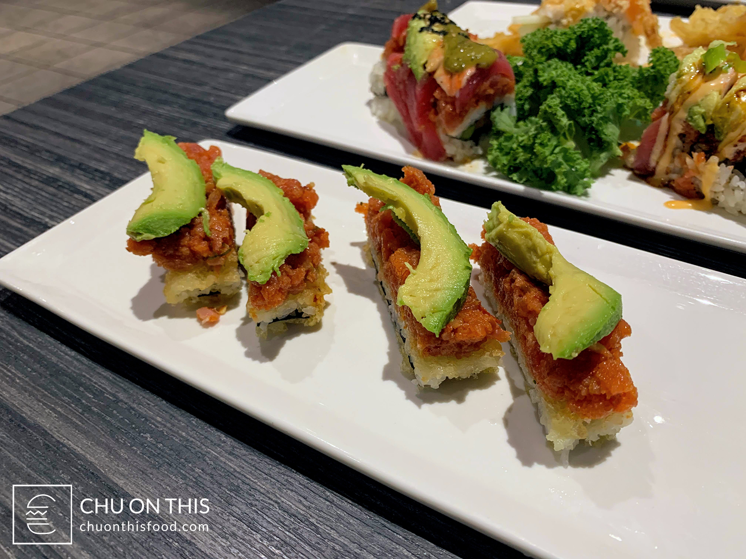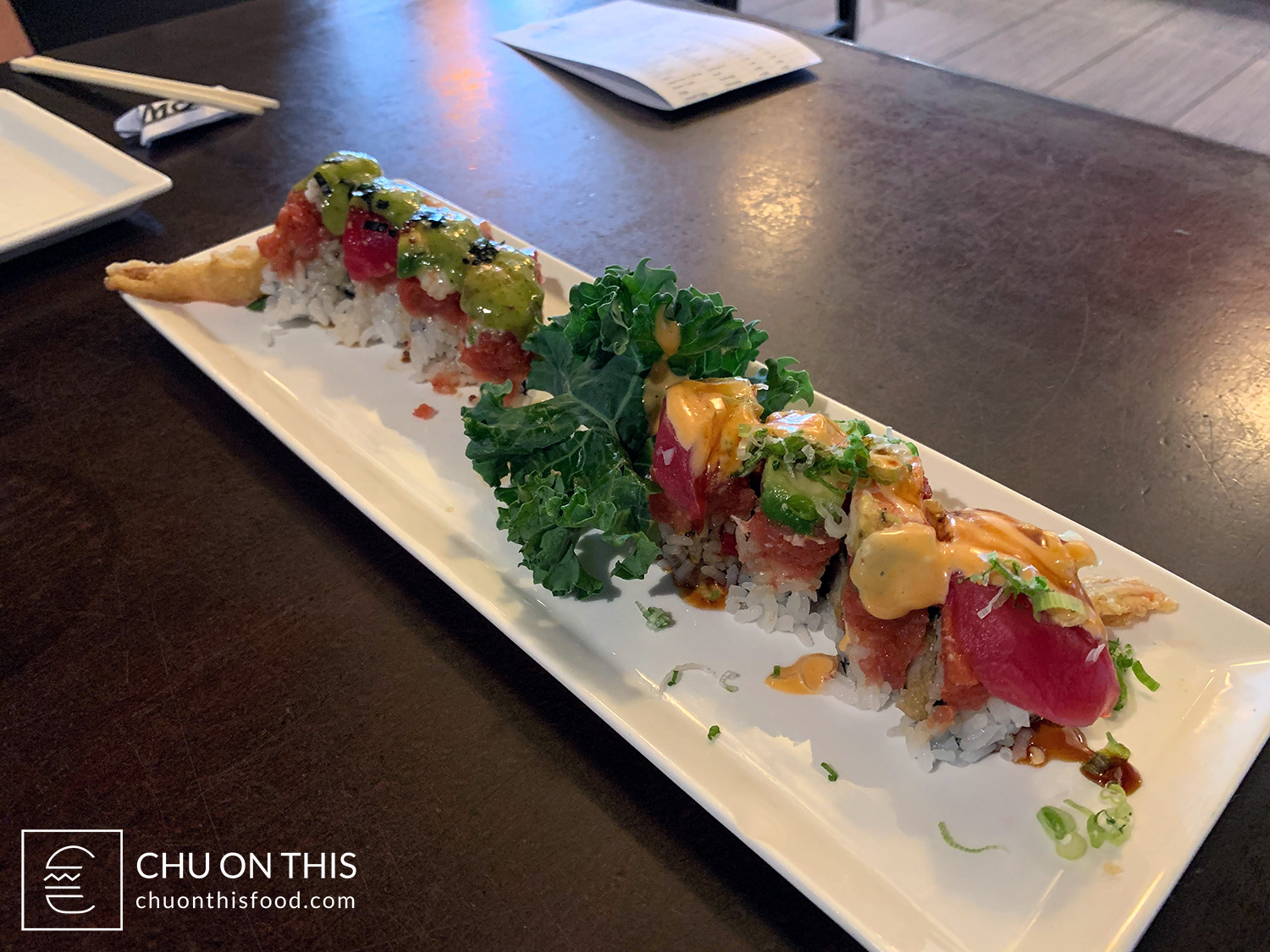 Asparagus, avocado, cucumber, shrimp tempura on the inside, topped with tuna, spicy tuna, spicy mayo, scallions, and House special sauce.
