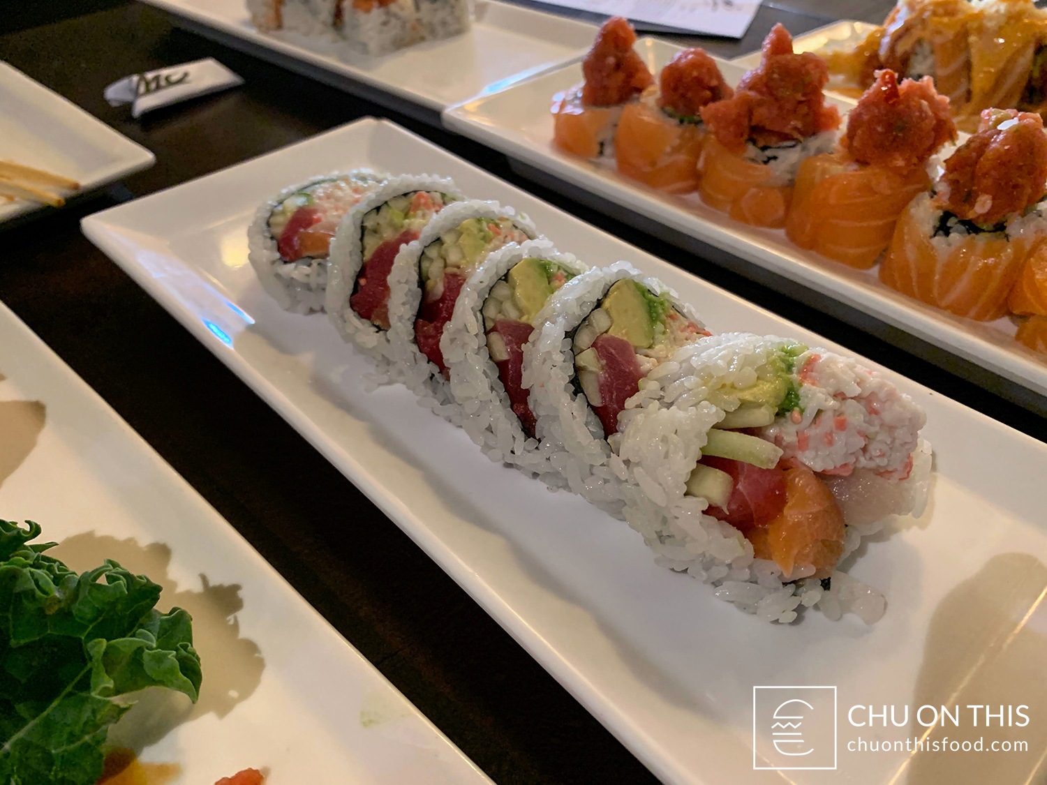 Krab meat, tuna, salmon, avocado, cucumber, and yellowtail inside.