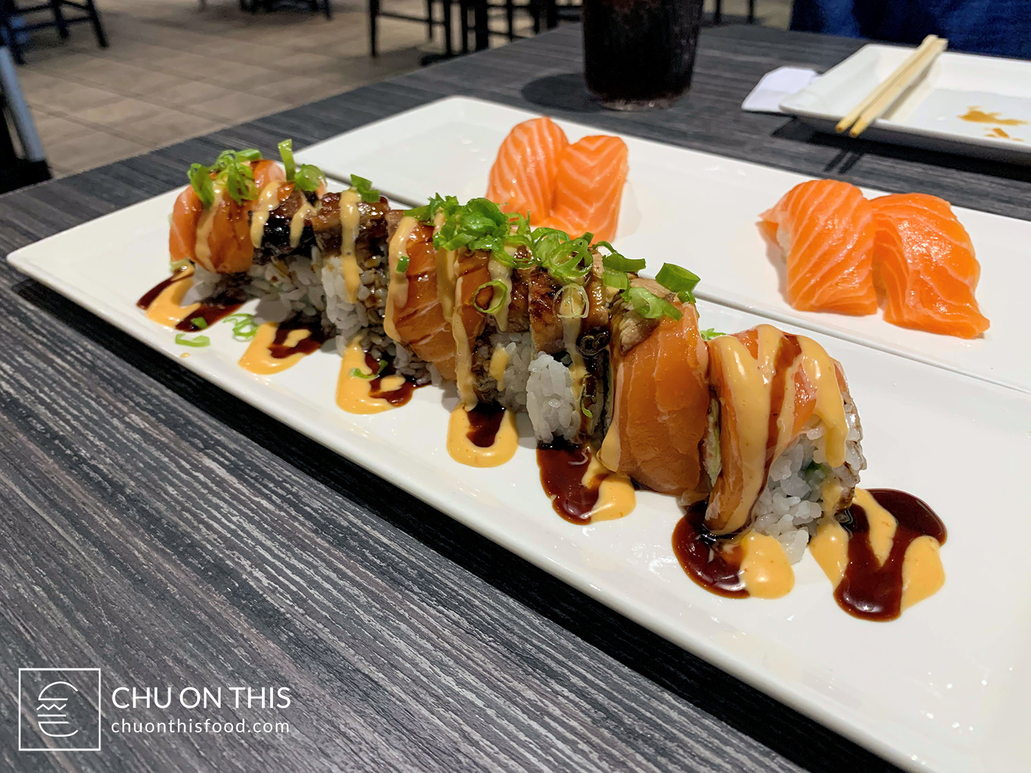 Krab meat, avocado, and cucumber on the inside, topped with salmon, eel, spicy mayo, eel sauce, and scallions.